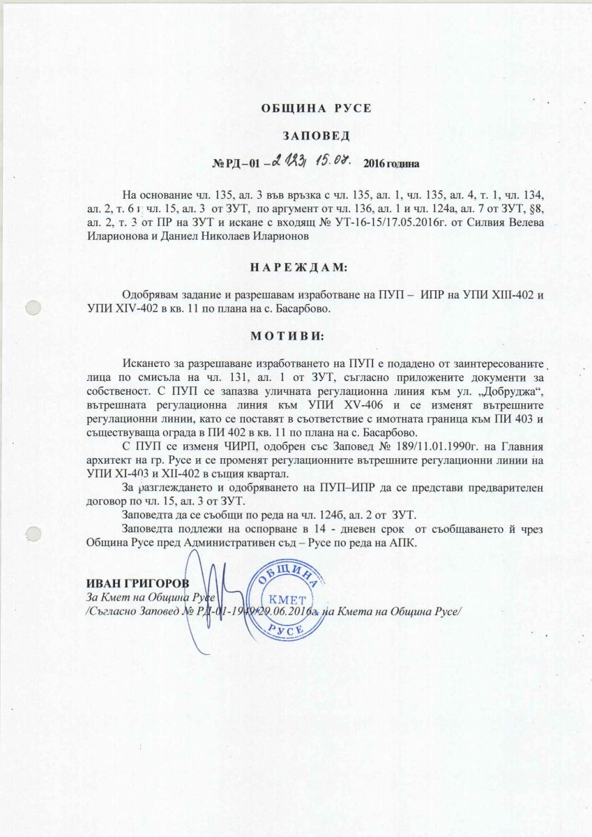 ЗАПОВЕД № РД-01-2123/15.07.2016 г.