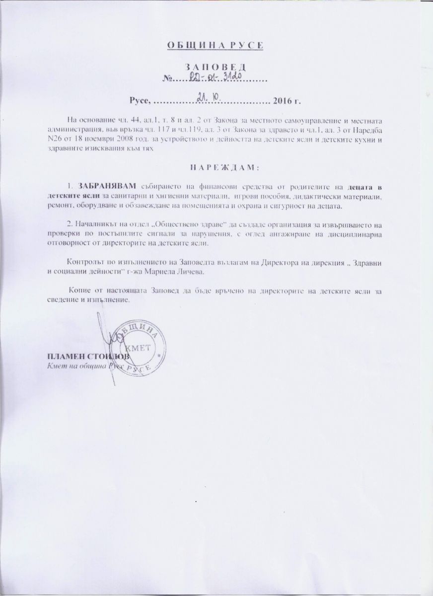 ЗАПОВЕД № РД-01-3120/21.10.2016 г