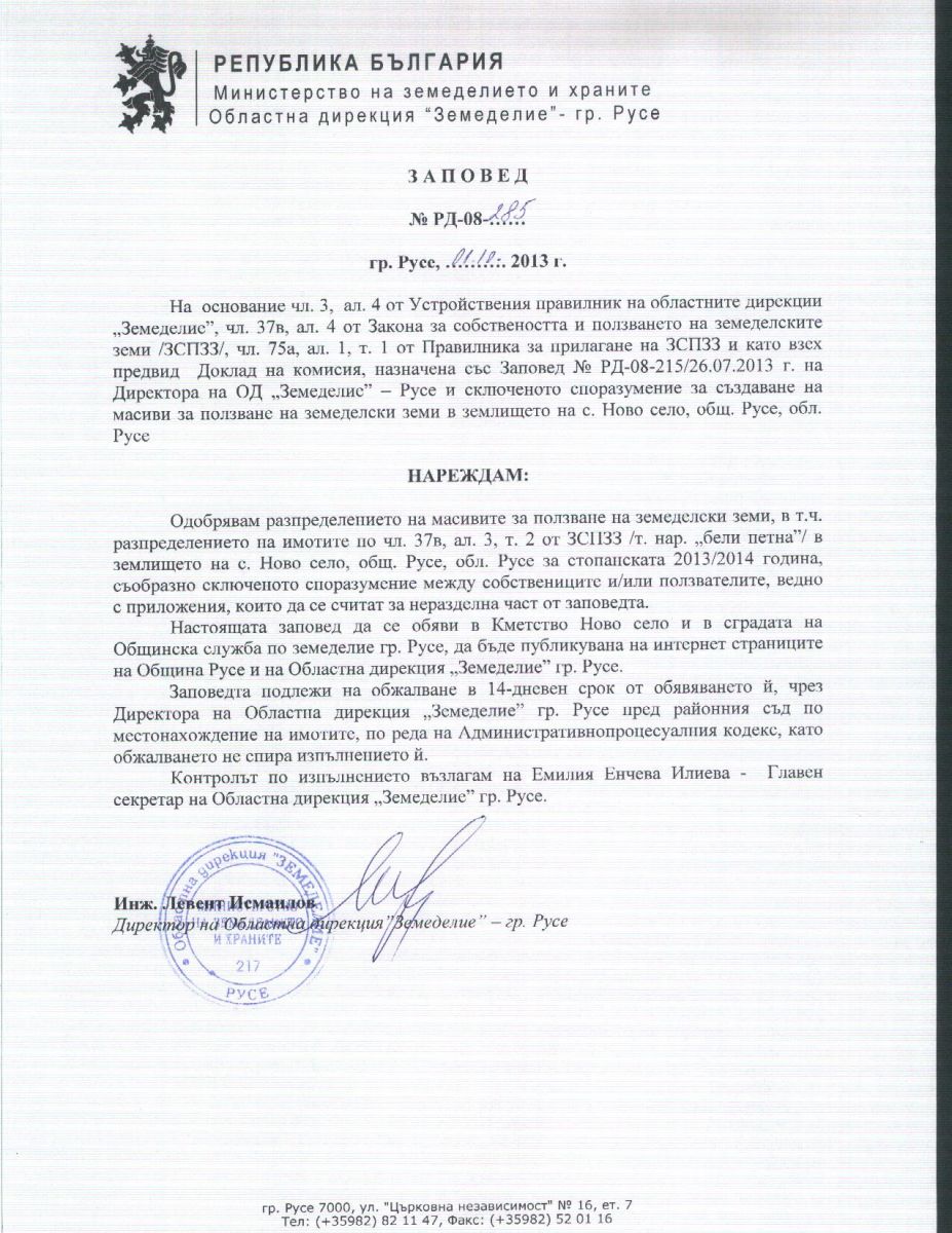 ЗАПОВЕД № РД-08-285/01.10.2013 г.