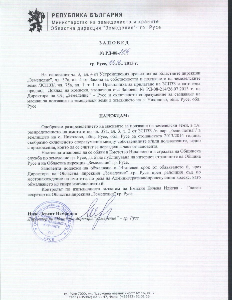 ЗАПОВЕД № РД-08-286/01.10.2013 г.