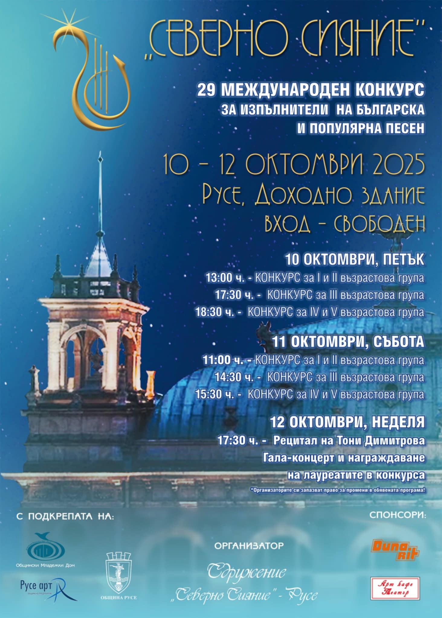 Днес започна 29-ото издание на Международния конкурс за млади изпълнители на българска и популярна песен „Северно сияние“. Събитието се организира от Сдружение „Северно сияние“ и негов директор е маестро Вили Икономов и с подкрепата на Община Русе и Общинския младежки дом.